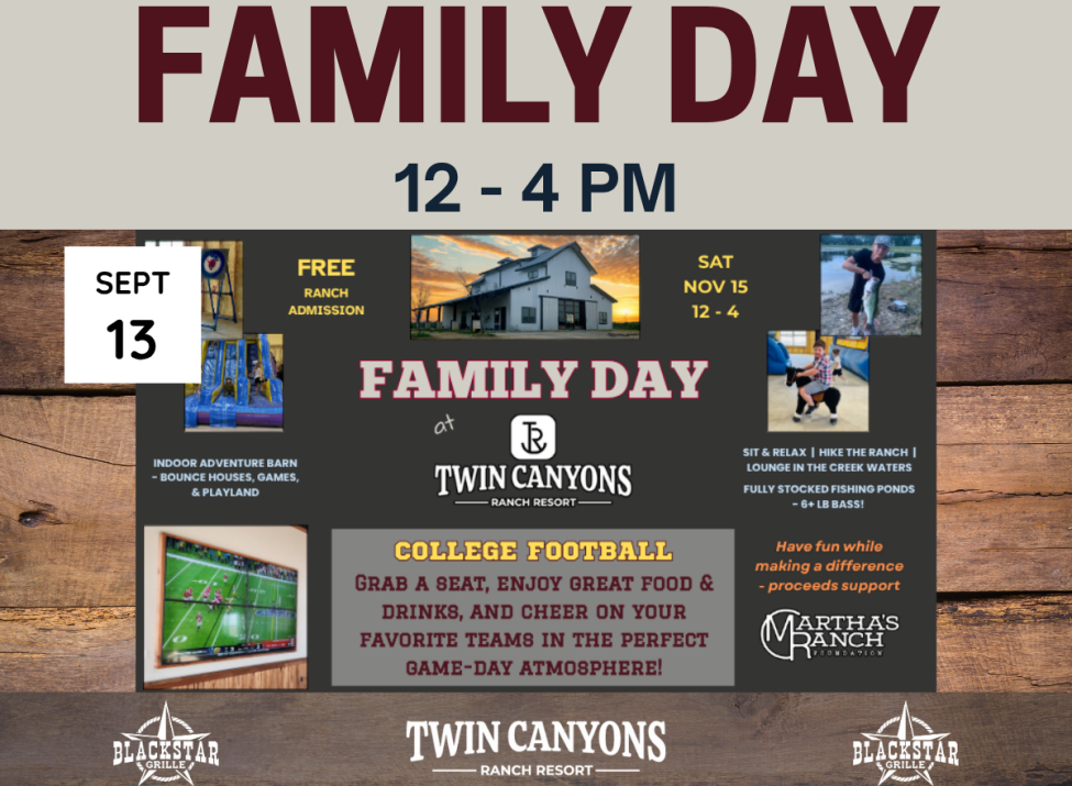 Join us Saturday, November 15 for Family Day at Twin Canyons Ranch Resort—a free, fun-filled event with bounce houses, games, fishing, hiking, and more! Grab delicious food and drinks while watching big college football matchups on large screen TVs. Bring the family, cheer for your team, and enjoy a perfect day at the ranch!