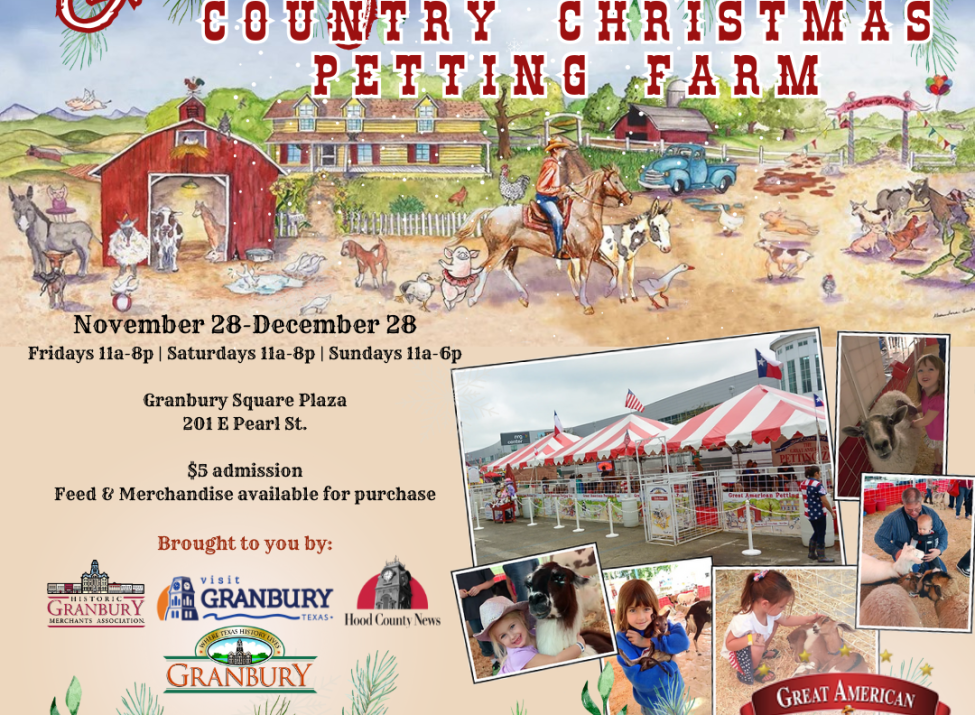 Bring the whole family to experience the magic of the season at the Granbury Country Christmas Petting Farm brought to you by Great American Entertainment Company, coming to the Historic Granbury Square Plaza the day after Thanksgiving through December 28th! Step into a winter wonderland filled with festive cheer, where kids and adults alike can meet and feed adorable farm animals, snap unforgettable holiday photos, and browse charming seasonal merchandise perfect for your Christmas gift list. It’s a heartwarming, family-fun tradition you won’t want to miss — right in the Celebration Capital of Texas!