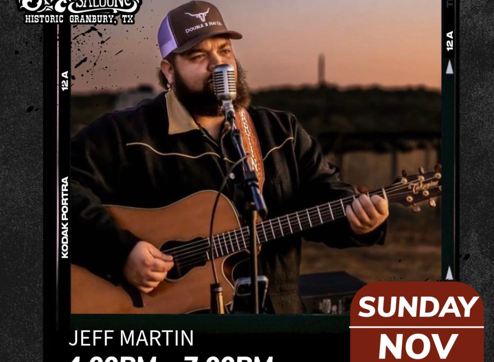 Join us for Sunday Funday with Live Music by the talented, Jeff Martin, Sunday 11/30 from 4-7 pm on the Patio behind the Saloon, located on Granbury Square! Free show & family friendly!